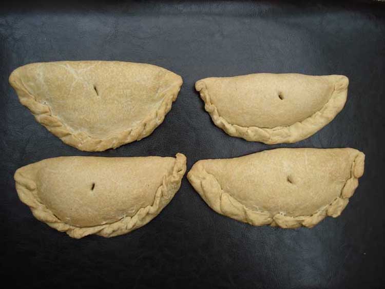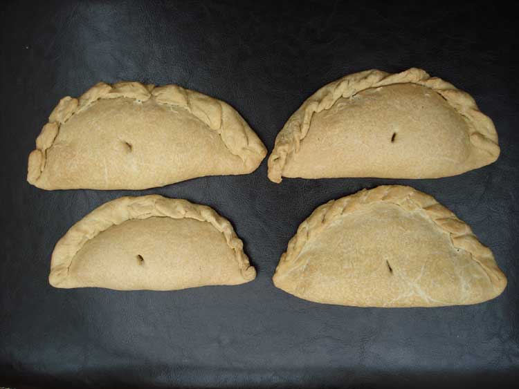 The explanation is this: the pasties were turned this way up for crimping. The pasties on the left were crimped in the normal way for a right-handed person, namely myself, starting at the left. The pasties on the right were crimped in the opposite direction, as would be done by a left-handed person. As I am not normally left-handed, so the quality of the crimping is not so good - but 'ee idn't bad, boy!