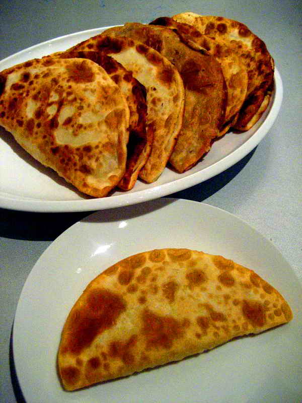The complete recipe, in fact two recipes (one making your own dough and a shortcut using flour tortillas), as well as some interesting feedback messages, can be found on the original blog page: Afghan Bolani and Scallion Turnover, 30 Dec 2009 on the Afghan Culture Unveiled web site. There are a few other photographs following the process. The web site is well worth a look, not just for food..