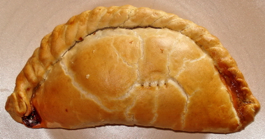 | Proper Devon Pasty from Jennycliff Cafe end view to show the Devon-style top crimp. |