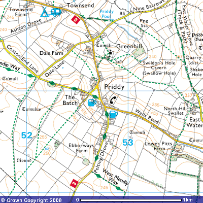 The Priddy is in Somerset link shows a Streetmap.co.uk page of the Priddy area. Unlike the OS map above, it shows the area is rich in archaeological remains. These can be seen better by clicking on the arrows around the edge of the map to move around the area - their density must rival that of remains anywhere in Devon and Cornwall The top right corner arrow leads to a better view of the Priddy circles.