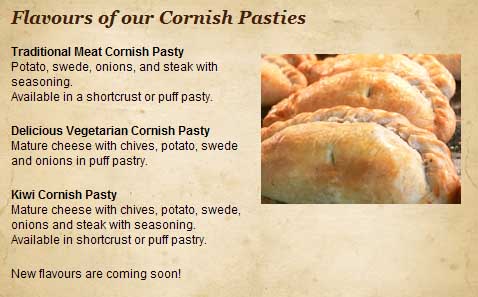 The pasties are not just the traditional Cornish pasty - there are vegetarian pasties, now becoming almost traditional in themselves in the pasty world, and the Kiwi Cornish pasty. The 'Kiwi' sounds rather good with cheese and chives along with the traditional ingredients. Also, new varieties are planned, so "watch this space" .....