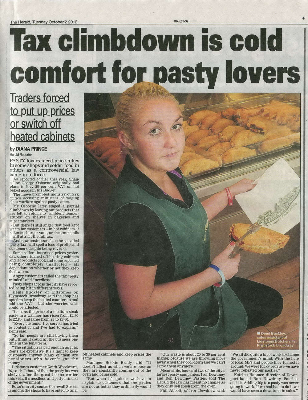 Demi Buckley, Lidstone's Butchers, Plymstock Broadway, featured in The Herald article about what the pasty tax really means